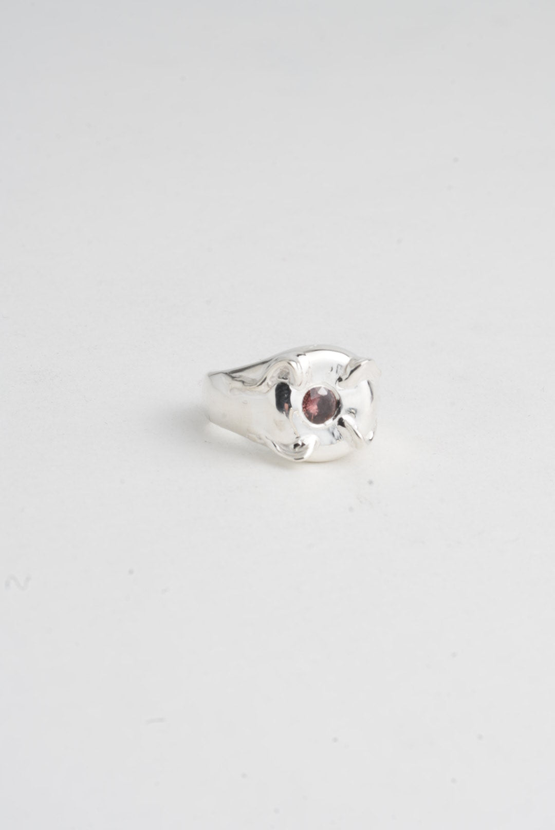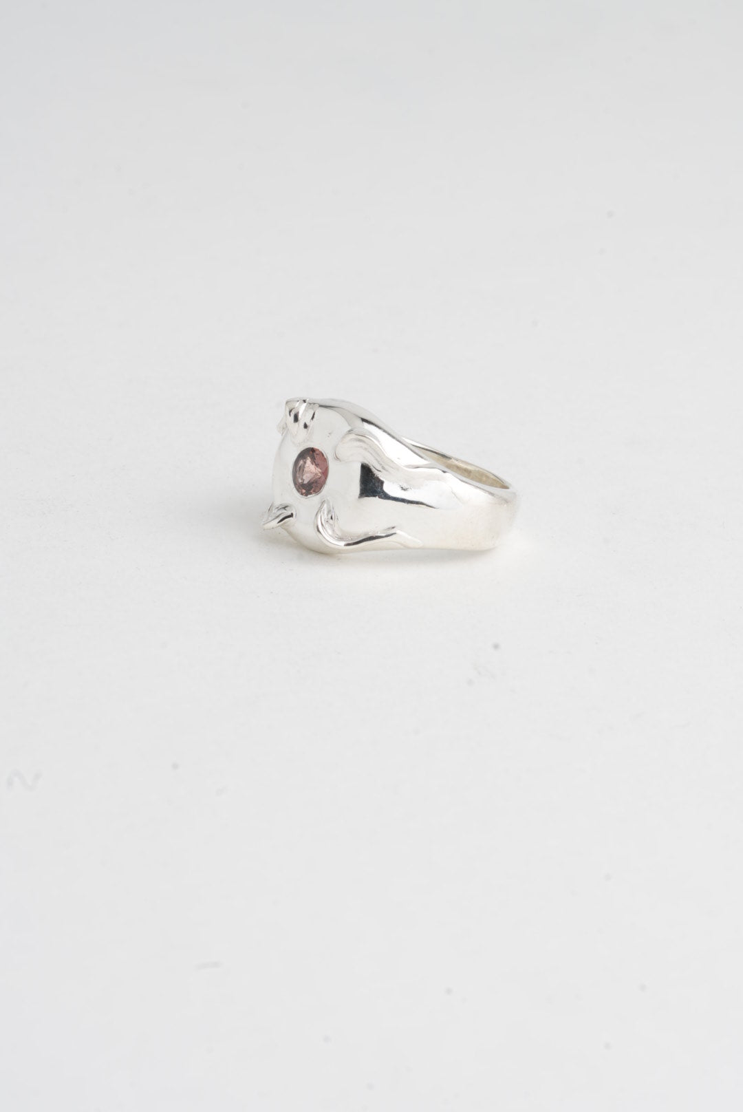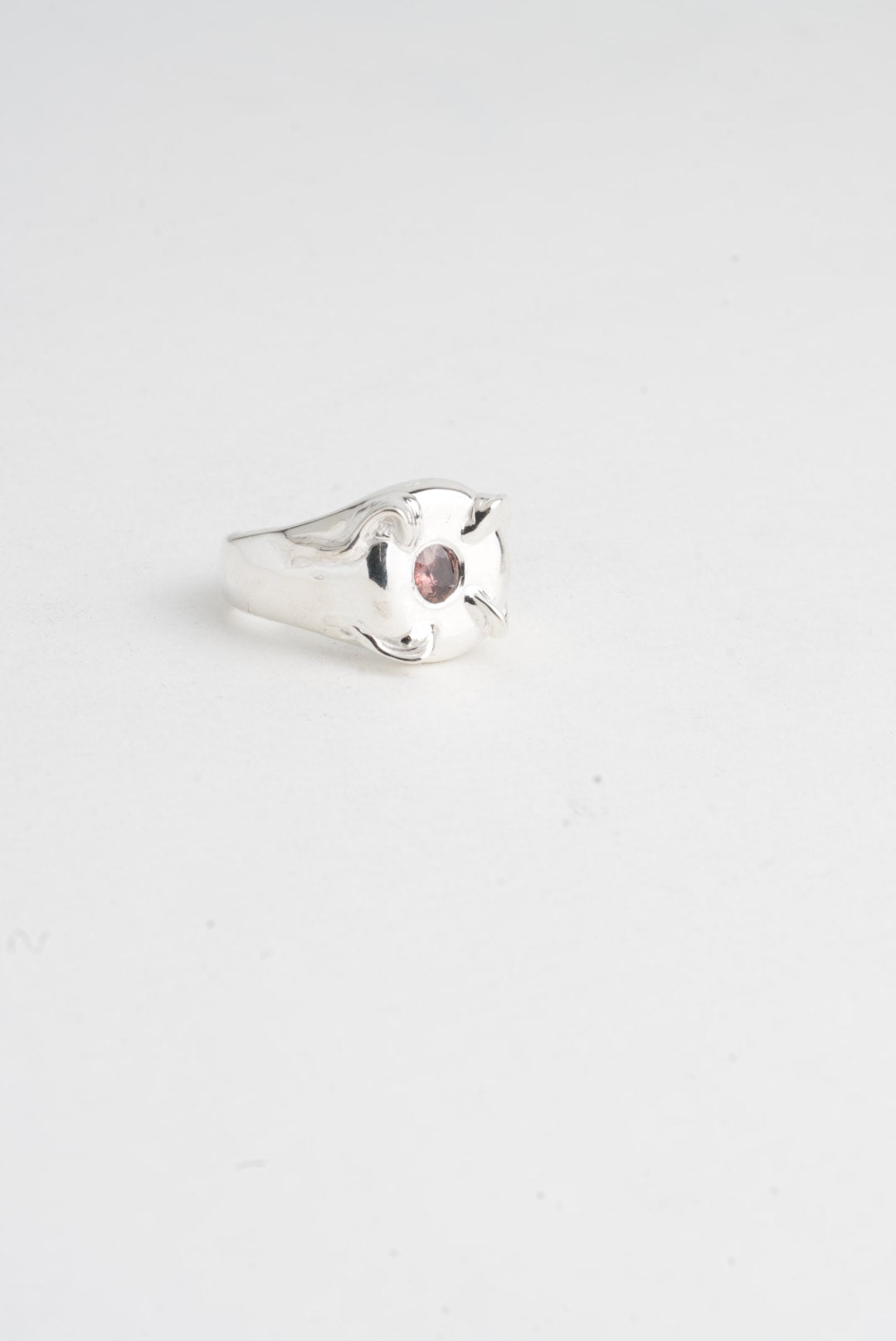 A mirror finish signet with tendrils creeping up the side, flush set stone.