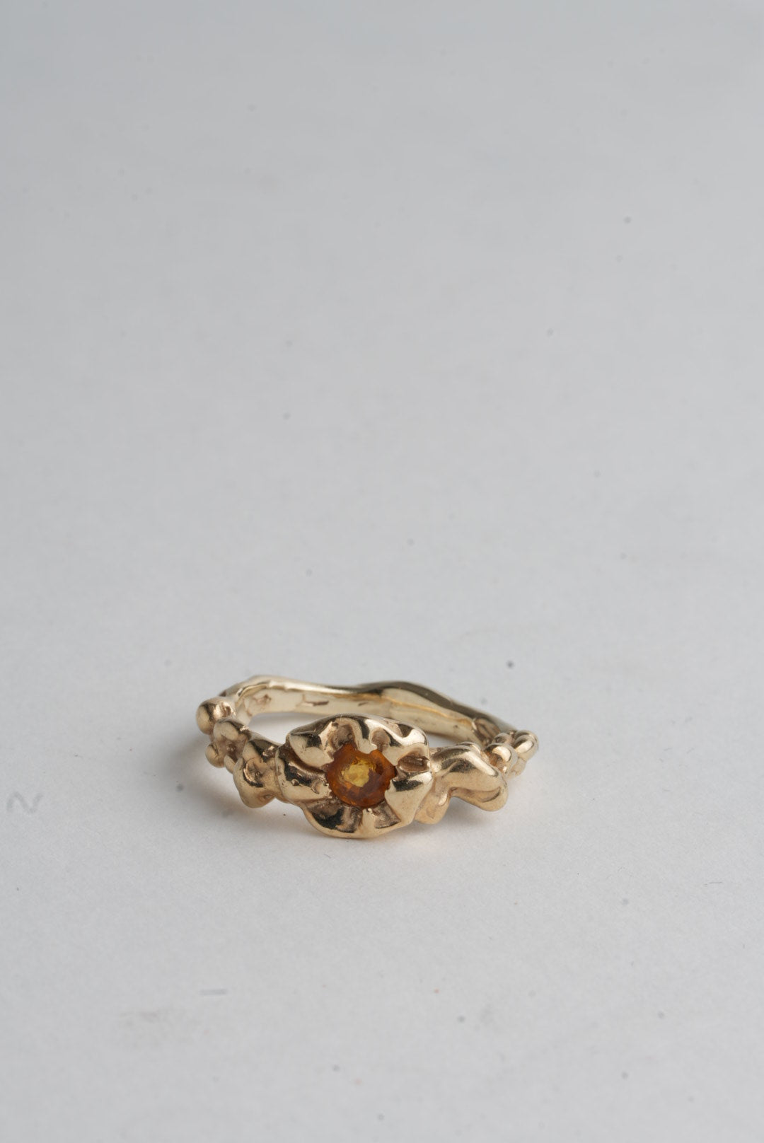 A combination of frills and bubbles, the Eleanor design in 9k yellow gold with an orange sapphire.